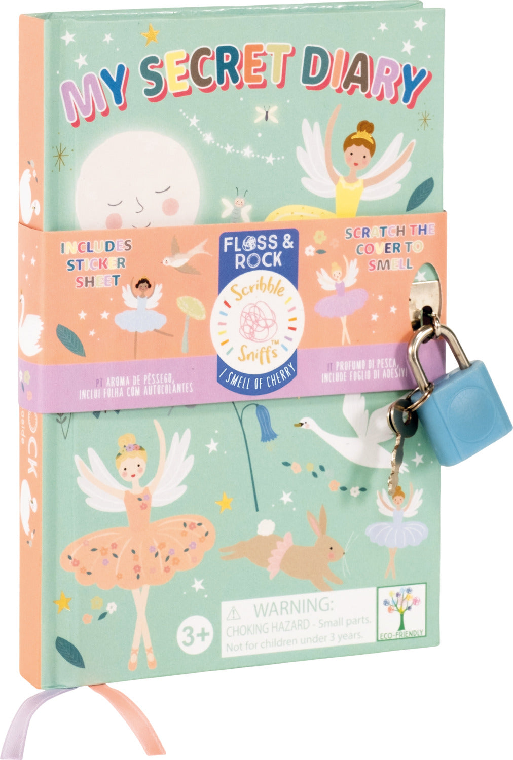 Wow…a SCENTED and SECRET diary. This Enchanted themed secret diary smells of cherry. Simply scratch the cover and you will reveal the scent. Includes a padlock and key AND a fun shaped sticker sheet with ballerinas, friendly forest animals and much more. There are multi-colored ribbon page holders too. Pages are lined. Perfect for travel and taking out and about.